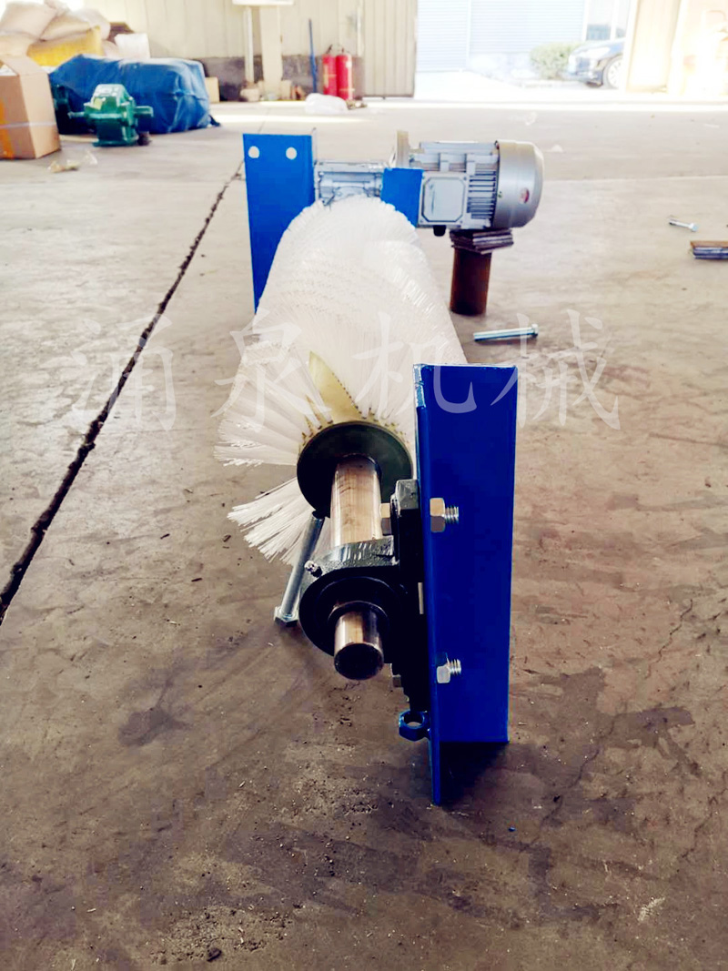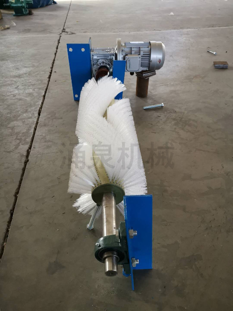 旋轉式清掃器位于輸送機回程輸送膠帶下方,有電動(dòng)機或者驅動(dòng)滾筒驅動(dòng)圓柱型清掃刷,刷尖與帶面輕微接觸,清掃刷的旋轉方向與回程輸送帶的運行方向相反,從而將粘在帶面上的微料刷掃下來(lái),達到徹底清潔的目的。