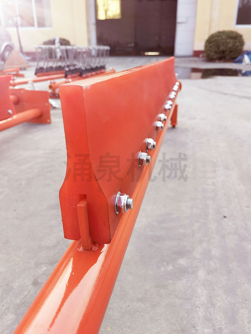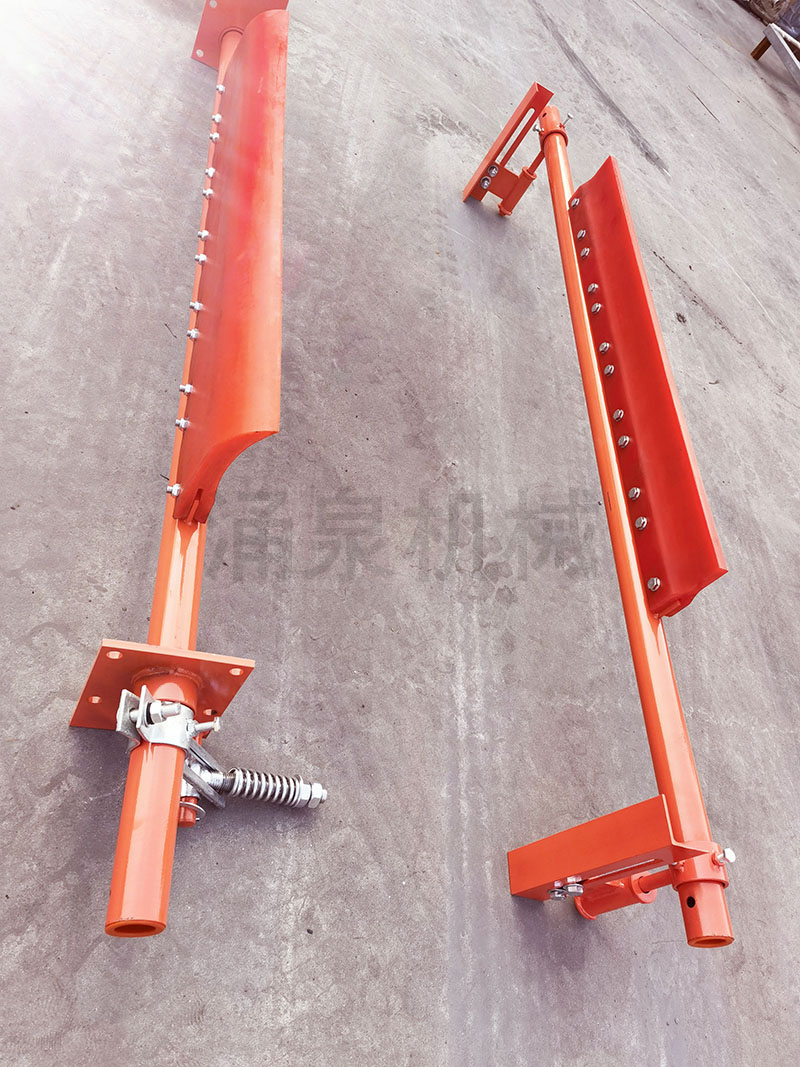 3.2 P型聚氨酯清掃器安裝在頭部滾筒下部回城輸送帶平直工作面處(見(jiàn)圖),支架寬度現場(chǎng)自行調節,與第一道清掃器配合使用,彈簧的壓力能自動(dòng)補償因刮刀與皮帶磨損產(chǎn)生的間隙,保持刮刀與輸送帶緊密接觸。
